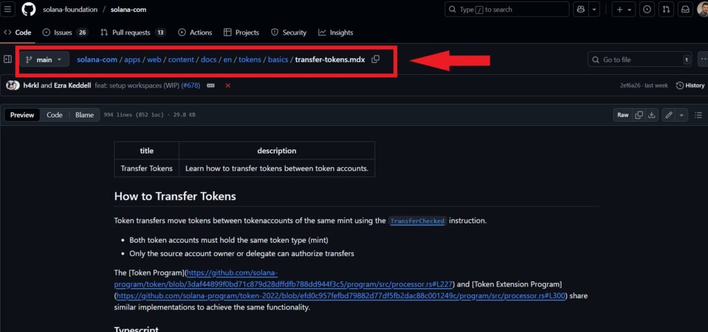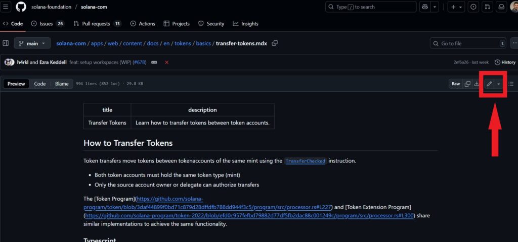 Click on “Propose changes” I wrote this “docs: Fix typo “tokenaccounts” to “token accounts”” for commit message and for description I wrote this “Fixed a typography error where “tokenaccounts” was missing a space and should be “token accounts”“.