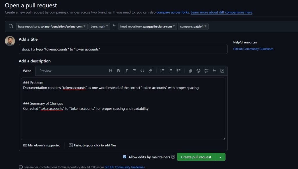 On Open a pull request, add a title “docs: Fix typo “tokenaccounts” to “token accounts”“, add the description. For the description they give you a template to follow. Therefore I added under the ### Problem “Documentation contains “tokenaccounts” as one word instead of the correct “token accounts” with proper spacing.” and under the ###Summary of Changes “Corrected “tokenaccounts” to “token accounts” for proper spacing and readability”. In the template there were also this “Fixes #”. Since, there’s no existing issue number, I remove it. Then click again the “Create pull request” button.