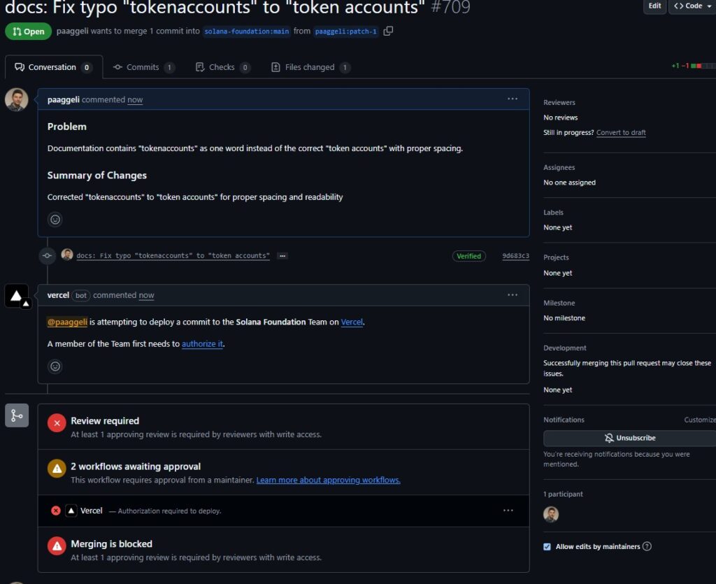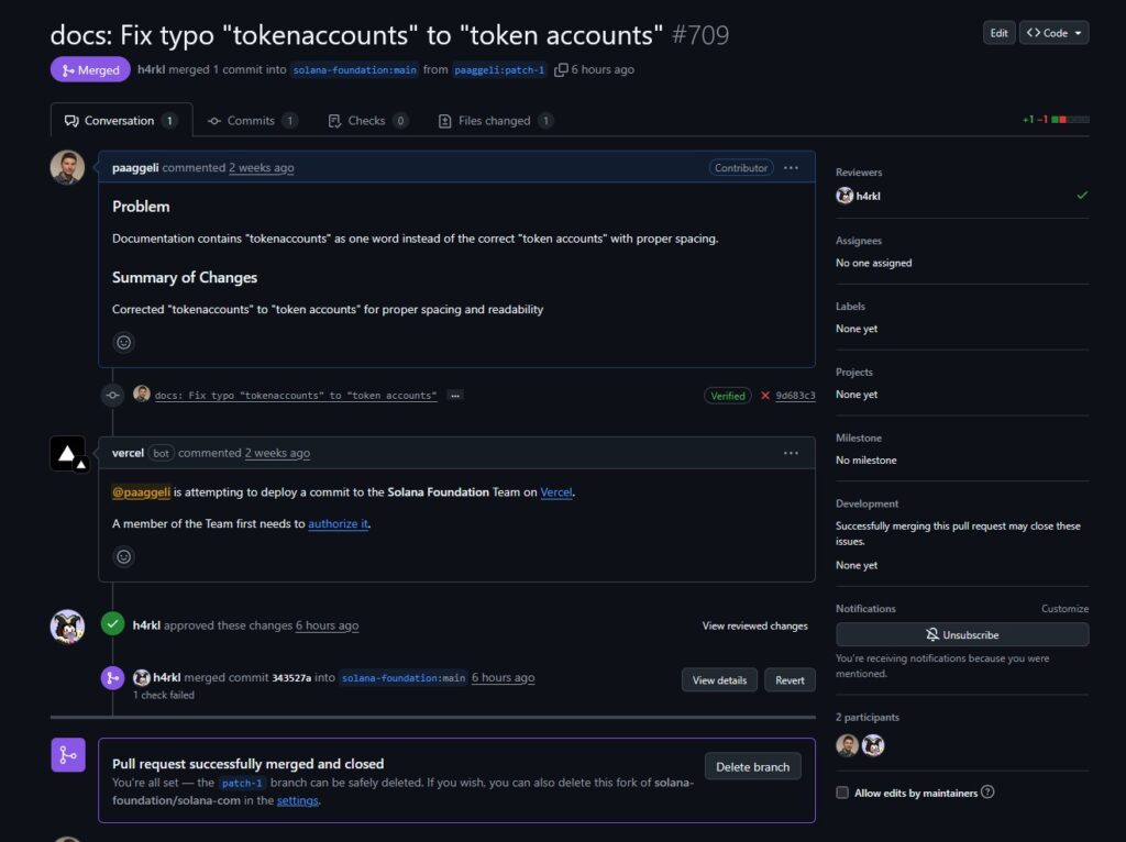When people think about contributing to a large open-source project like Solana, they often picture writing complex code or shipping major features. But contributions don’t have to start that way. My own first step was simply fixing a typo in the documentation. While minor, it became a meaningful way to begin engaging with the project and its community, learning its processes, and building the foundation for more significant contributions over time.